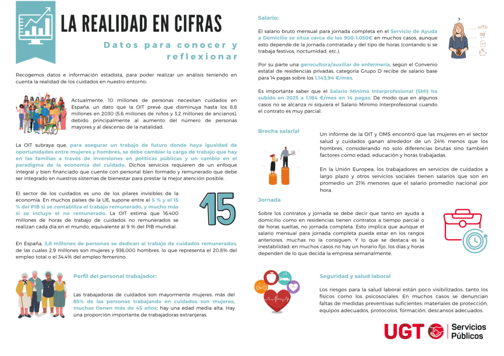Desde UGT Servicios Públicos creemos que es clave reconocer la contribución de los cuidados a la sociedad y por ello impulsar, fortalecer y consolidar los servicios públicos de cuidados. El sector de los cuidados es uno de los pilares invisibles de la economía. En muchos países de la UE, supone entre el 5 % y el 15 % del PIB si se contabiliza el trabajo remunerado, y mucho más si se incluye el no remunerado. La OIT estima que 16.400 millones de horas de trabajo de cuidados no remunerados se realizan cada día en el mundo, y esa cantidad es equivalente al 9 % del PIB mundial.