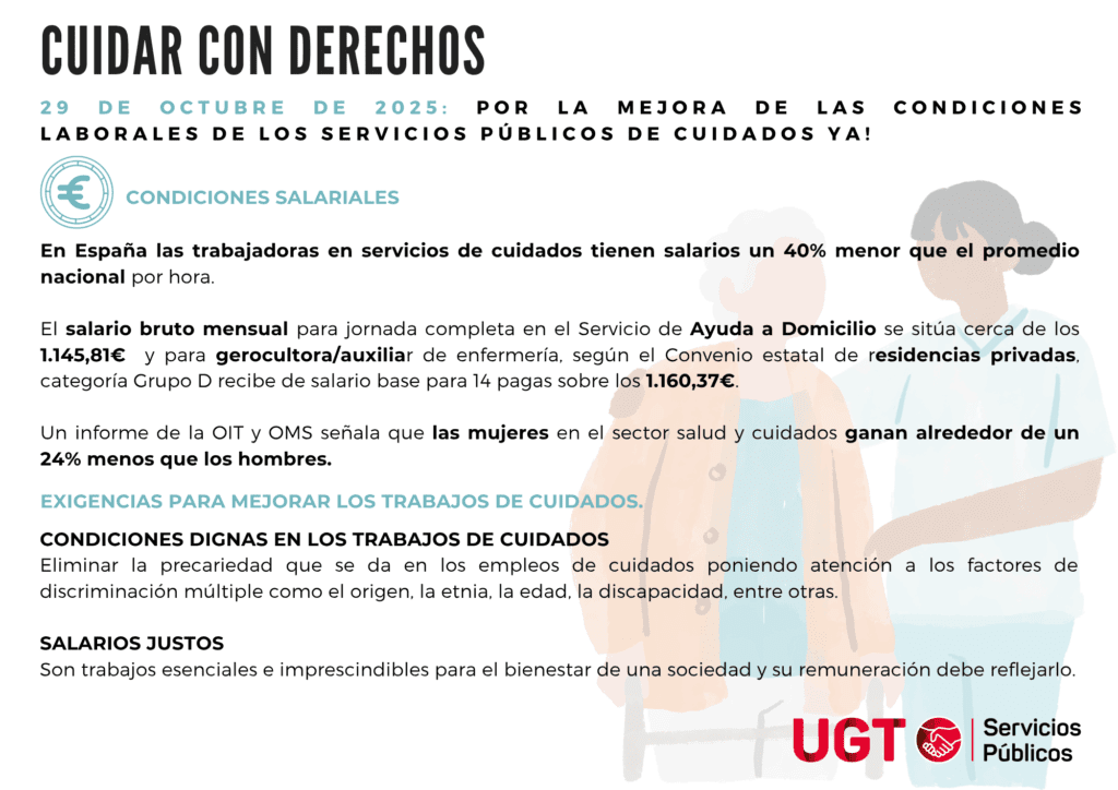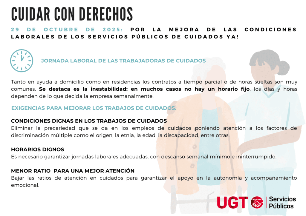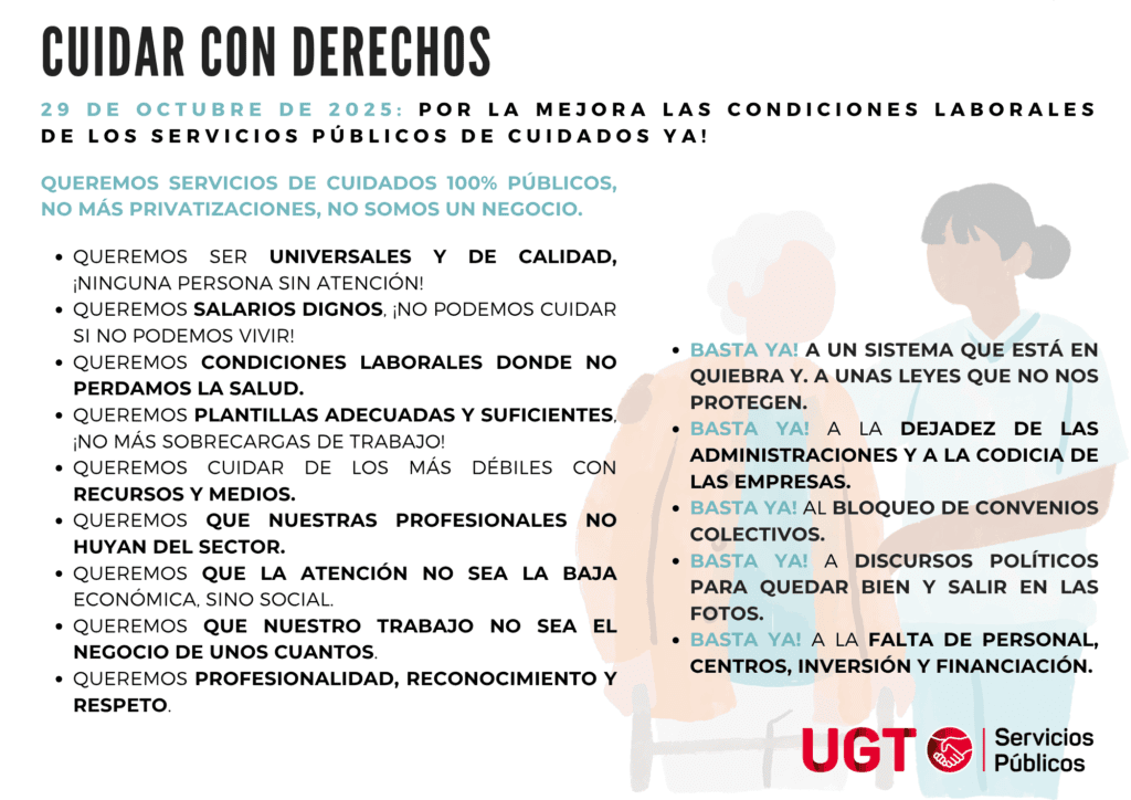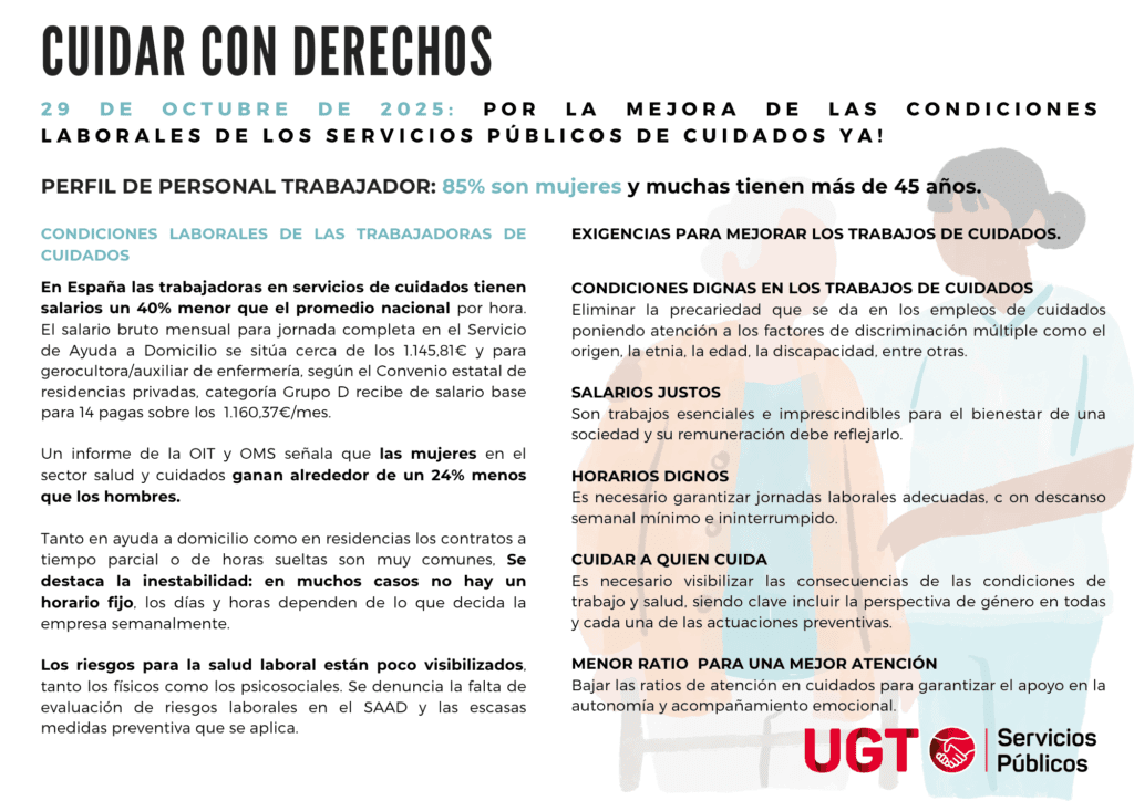 En UGT Servicios Públicos, con motivo del Día Internacional de los Cuidados y el Apoyo, 29 de octubre de 2025, desde la Secretaria del Sector de Servicios a la Comunidad y Atención Social y la Secretaria de Mujer e Igualdad presentamos la campaña Cuidar con derechos.