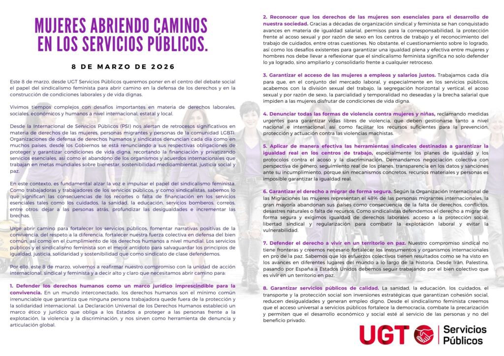 Conscientes de esta realidad, desde la S. de Mujer e Igualdad de UGT Servicios Públicos con motivo del 8 de marzo, Día Internacional de las Mujeres, presentamos la campaña “8M: Abriendo caminos en los servicios públicos”. Esta campaña reconoce el papel fundamental de las trabajadoras en la construcción de servicios públicos más justos, inclusivos y de calidad y tiene como objetivos: